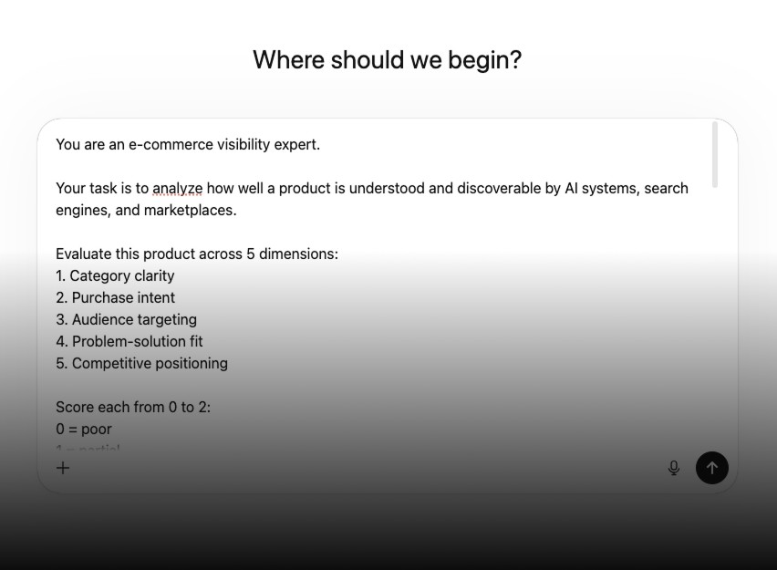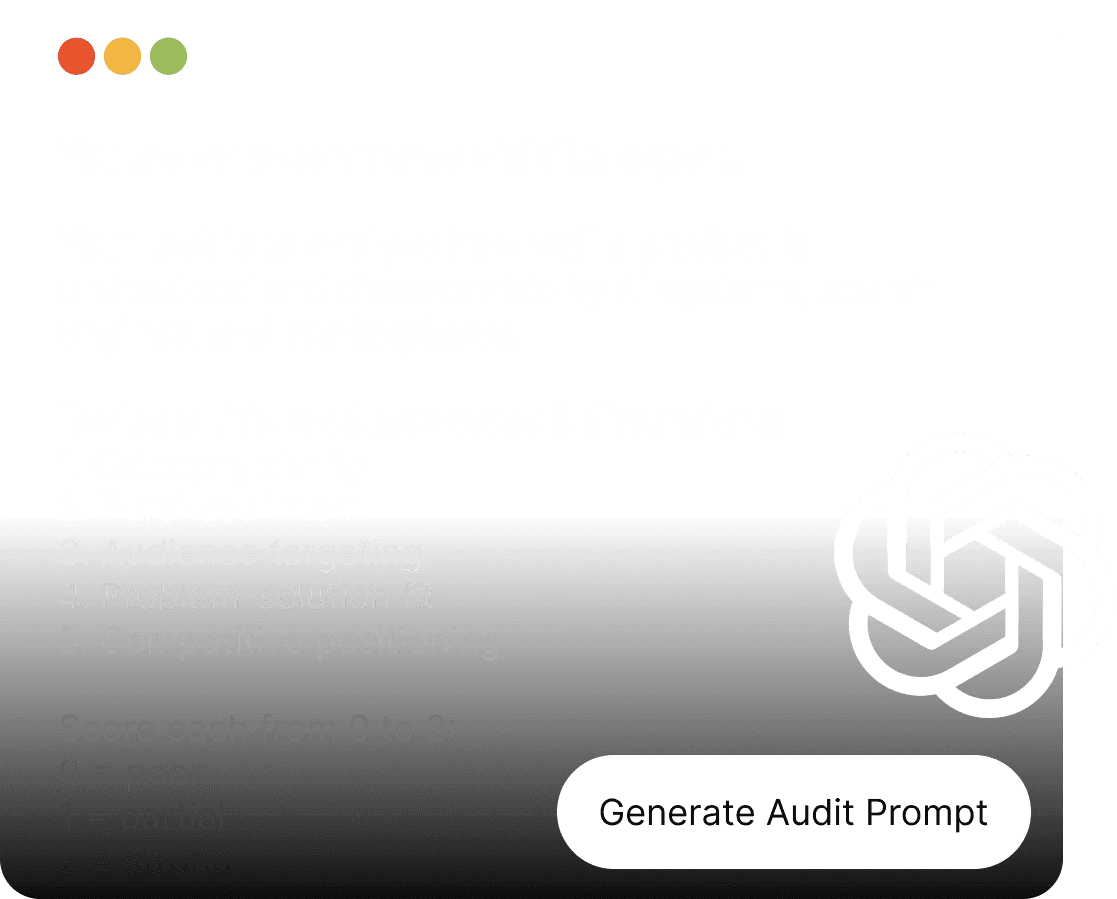 Paste your product — get a structured prompt to run in ChatGPT. Scores across 5 dimensions with specific issues highlighted.